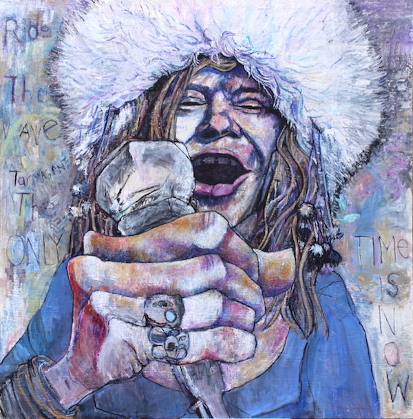 I found this image of Janis Joplin singing with Tina Turner. I loved it because of her white hat. It captured her iconic pouring of her soul into her music. I had to make up the hand with the microphone. One evening I was talking to a friend about his lucid dream. The next day I woke up with these words. “Ride the wave, man, the only time is now.” Using her vernacular of the word “man” was not working for me. So I hunted online for words for a female. The word “termagant” came up as a harsh tempered woman which I did not like. However the fictional character they used to describe a Termagant was Lisbet Salinger, who I absolutely love. So the next day while painting I spelled it wrong as tarmagant. And as an ode to my dyslexia I kept it.