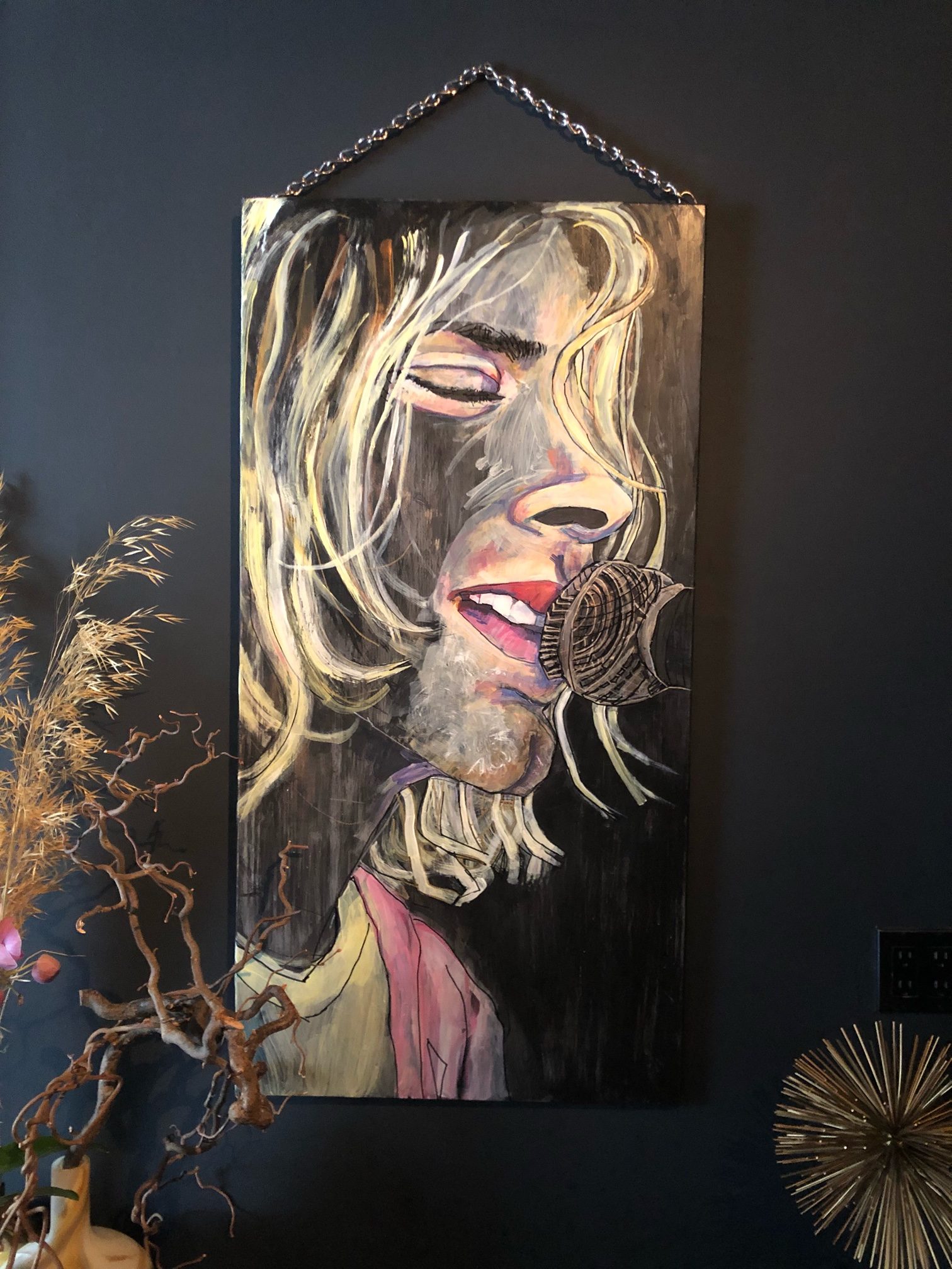 If you love Cobain, you love him with a chain. In this painting I painted him pretty, he was pretty. I painted this on a black desk top, and let the black shine through. I used the chain to hang it because it made sense. I really like how the tree and gold sparkle thing plays with his hair and microphone.