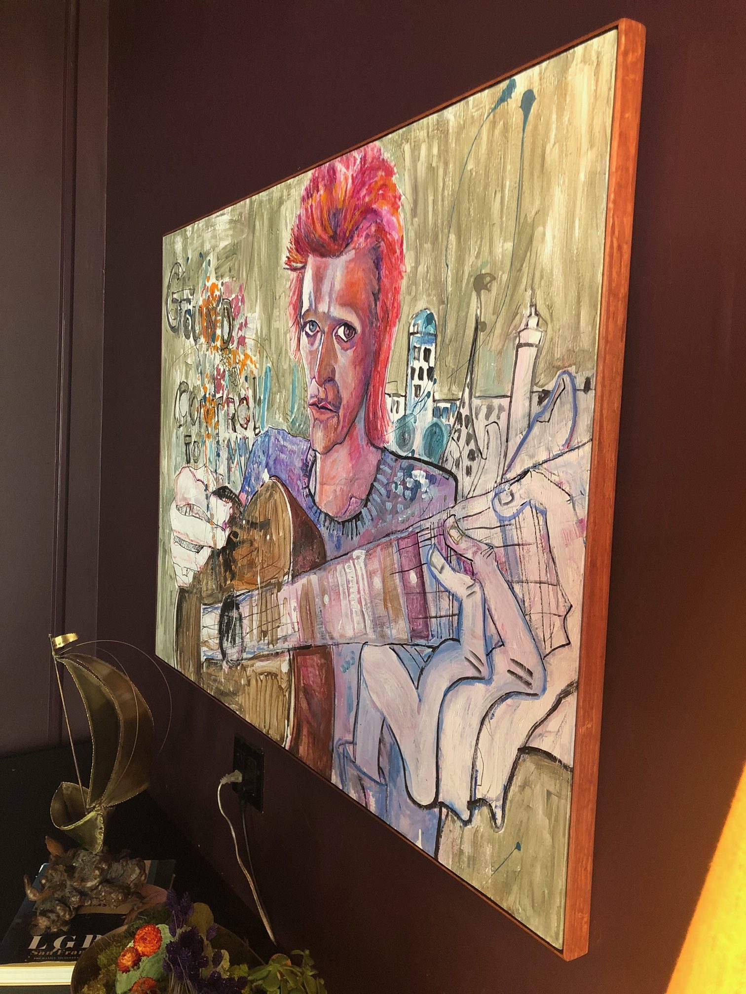 This beautiful painting of Ziggy Stardust is framed in a floating mahogany frame.  The painting is 48″ by 36″ so add 3/4 of an inch for the frame.  It looks beautiful at The Academy and would look great on any wall.
